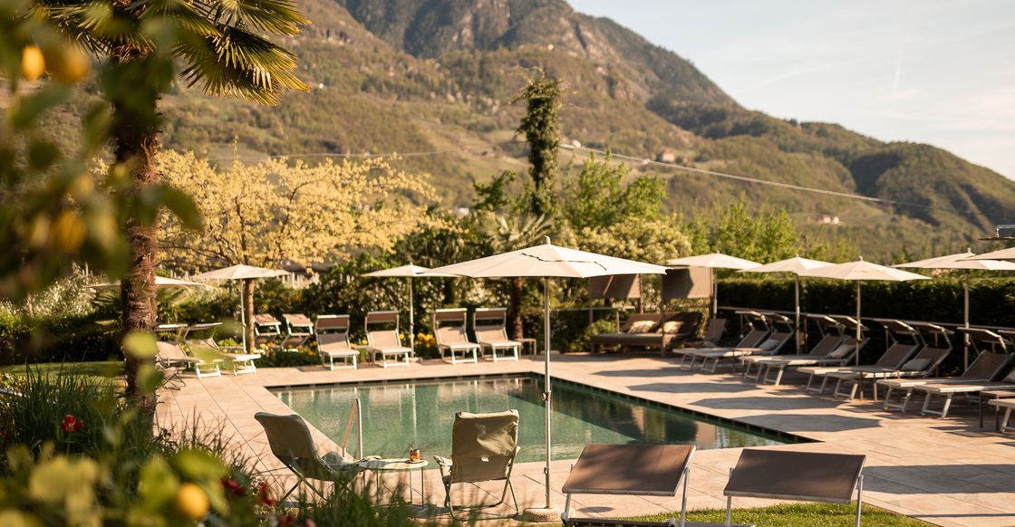 Nach Ihren Wanderungen in der Meraner Bergwelt oder einem Ausflug ins Stadtzentrum entspannen Sie in unserem Garten, am Freibad oder auf der Sonnenterrasse – pure Erholung garantiert!