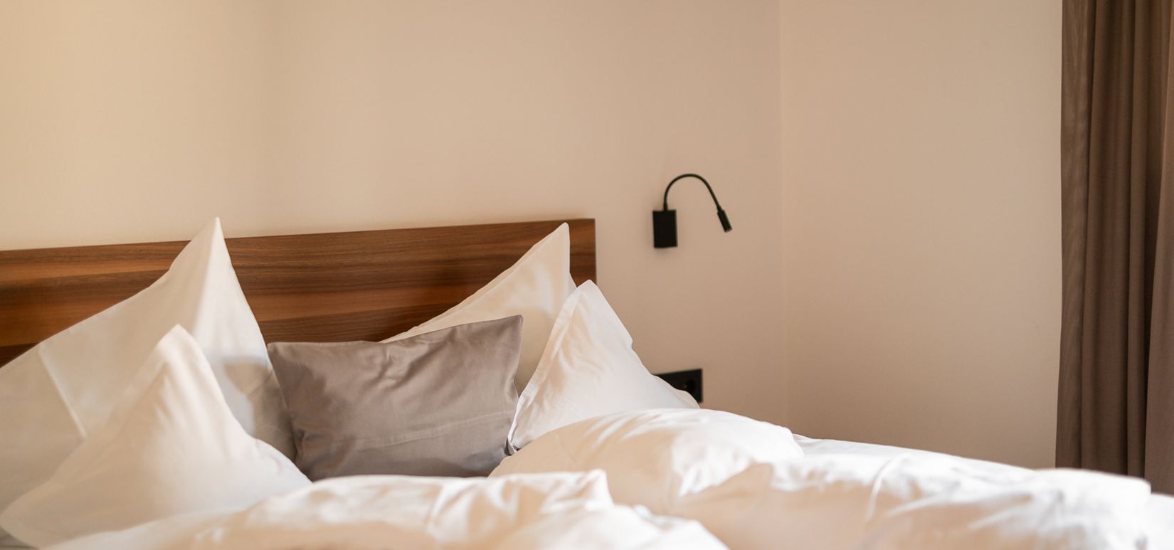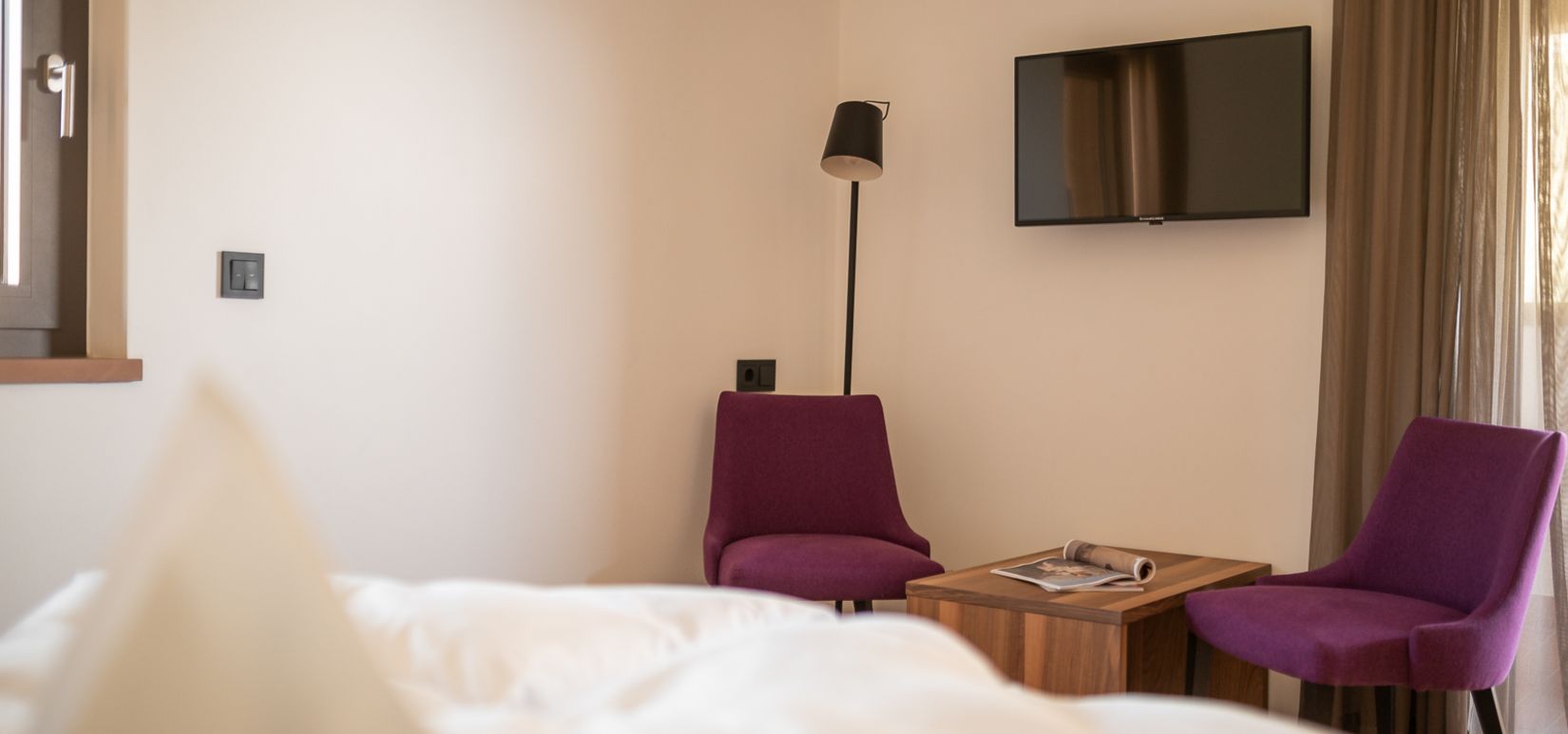 Gemütliche Südbalkonzimmer mit Sicherheitstüren und Keycard, ausgestattet mit Dusche, WC, Haarföhn, Sat-TV, Telefon, Safe und großem Balkon mit klappbaren Hochlehnern. Mehrere Zimmer sind auch mit einem 3. Bett ausgestattet.